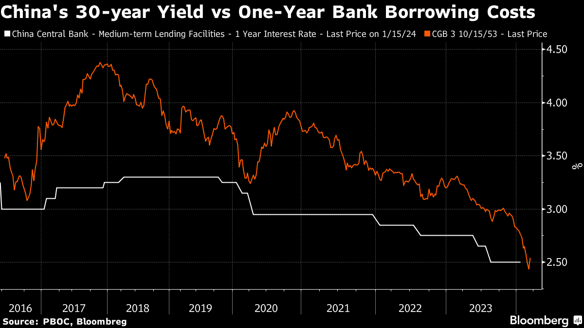 尽管美国正在努力控制通货膨胀,北京正在对抗通货紧缩。因此,中国债券市场一直是世界上表现最好的市场之一。自2020年底以来,30年期收益率已下降了150个基点,于三月初达到了2.4%的历史新低,与相当于德国债券的收益率相当。