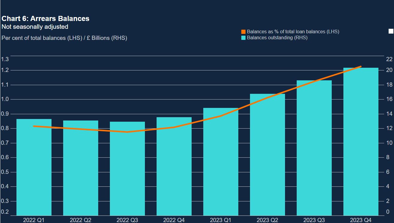 数据显示,拖欠情况略有好转,拖欠抵押贷款余额的价值比上一季度增加了9.2%,达到203亿英镑。这比一年前高出50.3%,而拖欠贷款总余额比例从上一季度的1.12%增加到1.23%,是自2016年以来最高。