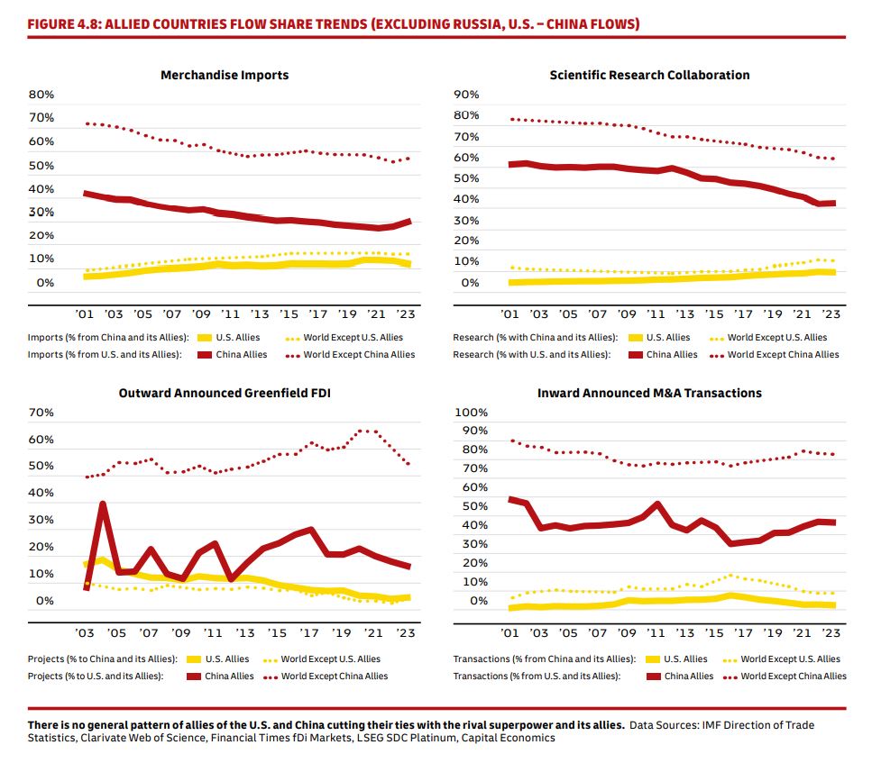 尽管两个最大经济体之间的贸易正在减少,但报告发现“最近没有任何密切盟友大幅转向与对手超级大国及其盟友的贸易流动。”