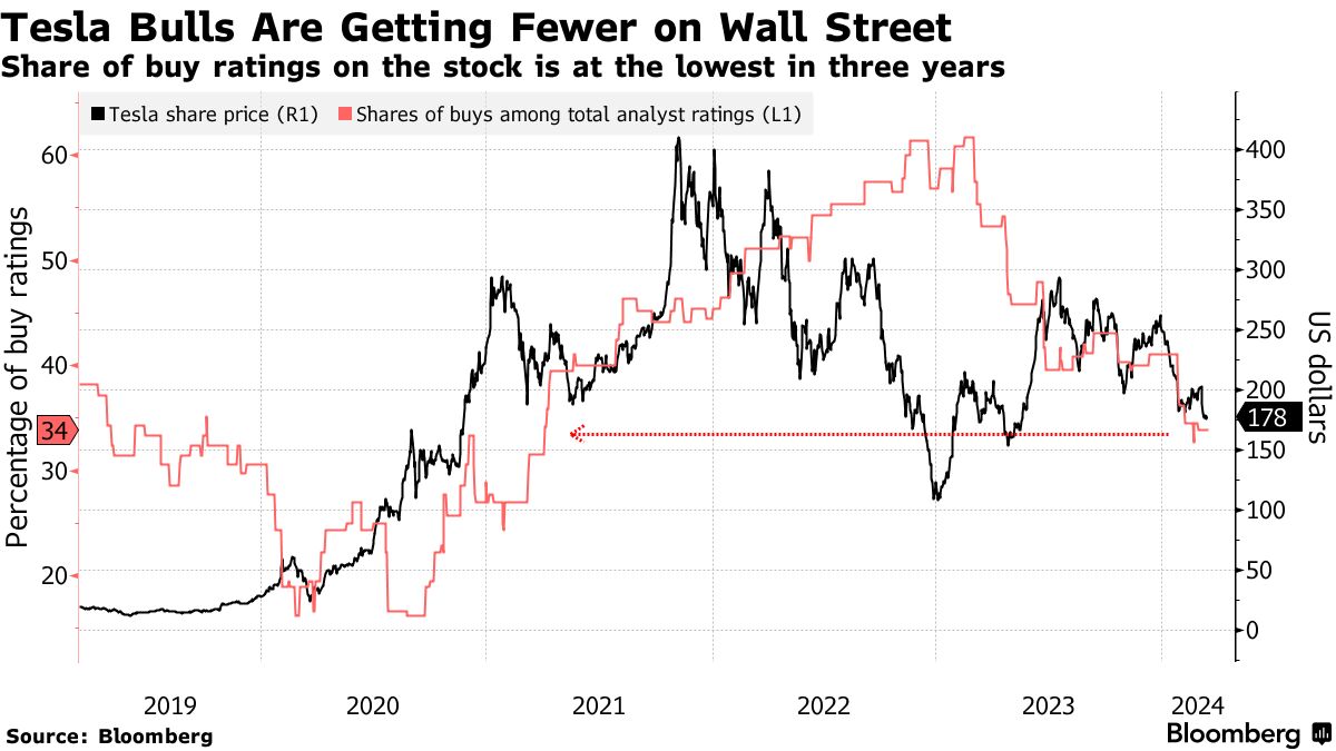 特斯拉分析师越来越谨慎,对该股票的看涨评级比例已降至自2021年4月以来的最低水平。在该公司在1月份表示今年的增长将会“明显降低”之后,情绪恶化,而其他汽车制造商、电动汽车供应商甚至租车公司也对电动汽车的近期需求发表了类似谨慎的评论。