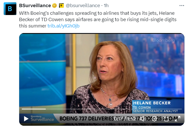 波音公司 在1月份737 Max飞机门爆炸事件后与监管机构的纠纷加剧了压力,因为航空公司限制飞行,等待新飞机的交付。但波音并不是航空公司唯一的痛点(而且其股价正在伤害其投资者)。 Becker指出,美国官员寻求减少延误的纽约航班,这加剧了航空公司的困境。该市场的可用座位减少了5%至7%,而需求增长了6%至10%。