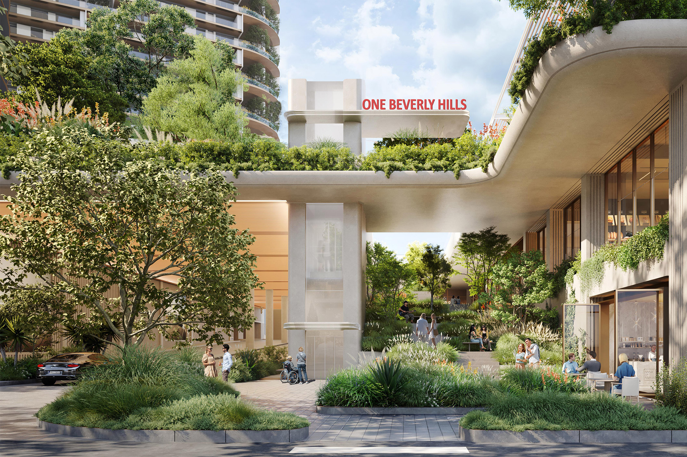 One Beverly Hills的计划渲染,从Santa Monica Boulevard看过去。来源:Foster + Partners & Kerry Hill Architects