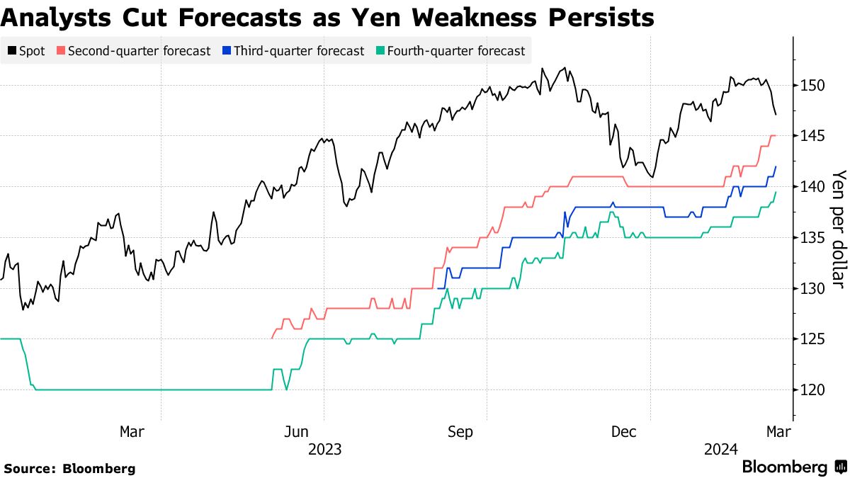 野村证券、瑞穗银行和花旗环球市场日本有限公司等机构最近都下调了他们对日元的预测。在彭博调查中,日元预计将在2024年以140日元兑换1美元结束,仅比当前水平强5%。