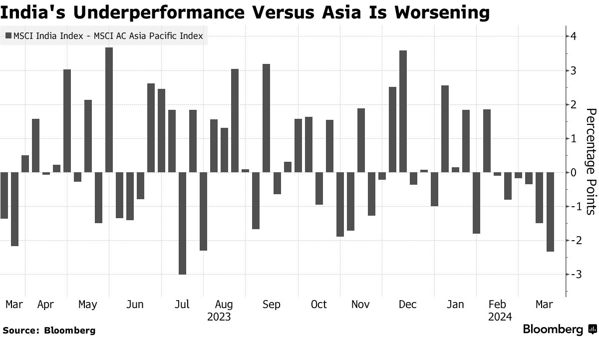 随着情绪恶化,投资者也在撤出价值过高的大型股票。印度MSCI指数连续第二个月落后于MSCI亚太指数。一些投资者预计损失将进一步扩大。