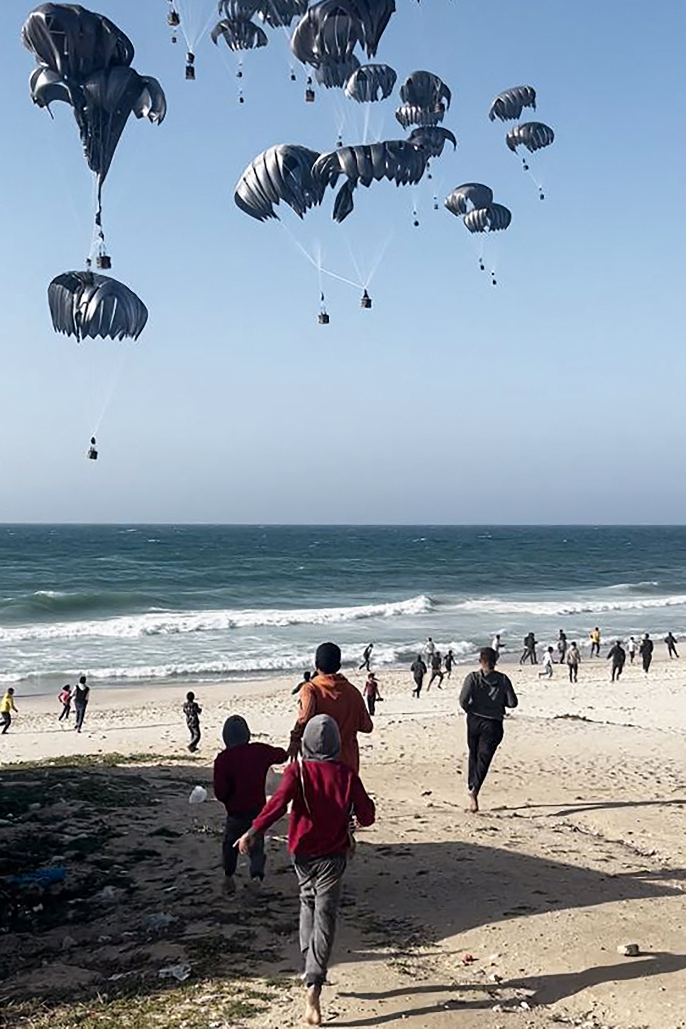 在这个过程中,拜登政策中的矛盾变得太明显,无法忽视。只需看看加沙上空的天空:以色列人投下的炸弹在很大程度上是美国制造的,与此同时,美国还在加沙海滩上空同时空投食物盒、水瓶和药品。(还将建造一个浮动码头,以海上运送更多援助物资。)白宫承认这些努力就像在心脏手术后贴上创可贴一样。更讽刺的是,一些人道主义空投甚至意外地导致加沙人死亡。死亡了加沙人。