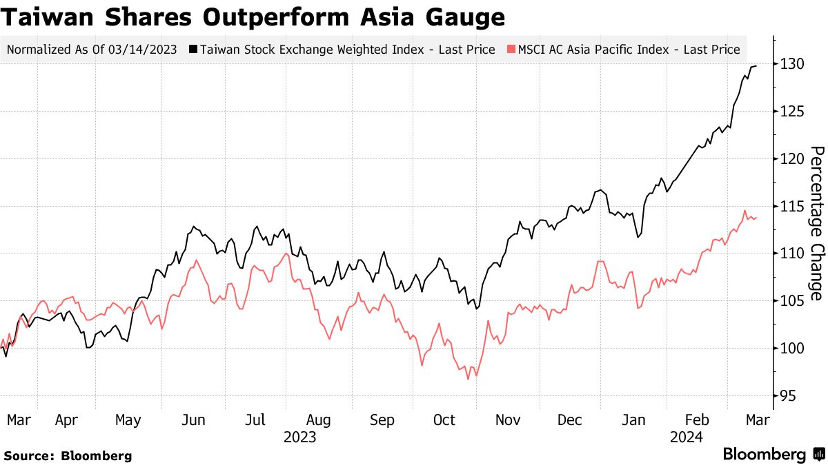 台湾加权股价指数在过去几周一再创下新高,这是由于全球对与人工智能热潮相关的技术硬件的强劲需求。