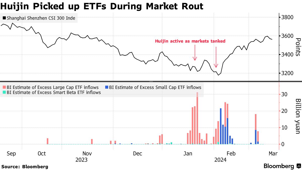 所谓的“国家队”,包括主权财富基金中央汇金投资有限公司,在一份BI的报告中显示,大部分购买发生在一月底和二月初,通过交易所交易基金进行。报告显示,上周头两天可能花费了约50亿美元,但之后资金流动几乎消失,数据显示。