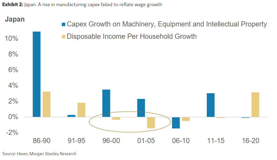 团队指出,日本在上世纪90年代采取了类似的供给侧刺激框架。由于对经济的非贸易部门提供的支持有限,工资增长放缓,通缩开始。对于当今的中国,他们写道,风险倾向于“持续通缩”。