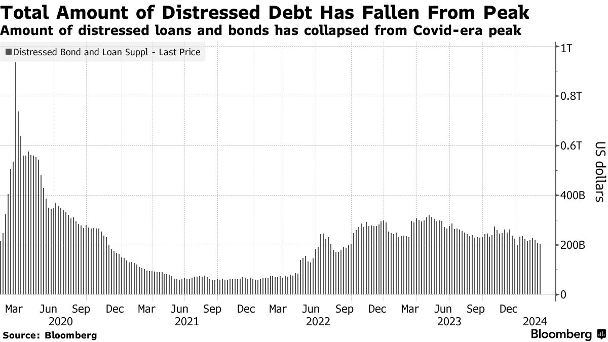 全球范围内的受压债务总额已经从疫情高峰时的将近1万亿美元减少到仅剩2080亿美元。与此同时,较高的利率帮助资金管理人员从略微更安全的债务中获得丰厚的高收益票息。