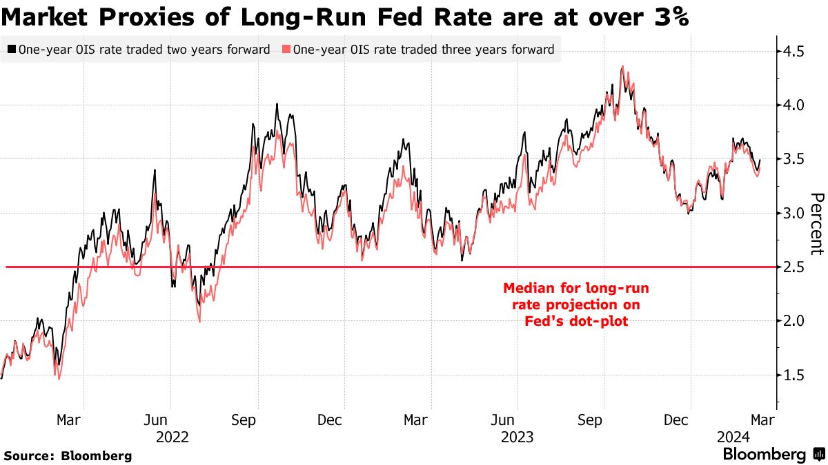 这些预测还包括对“长期”政策利率的估计,被视为他们对“中性”利率的一种代理,即既不刺激也不拖累经济的立场。自大流行病爆发前以来,美联储决策者对中性利率的中位数一直保持在2.5%或更低。