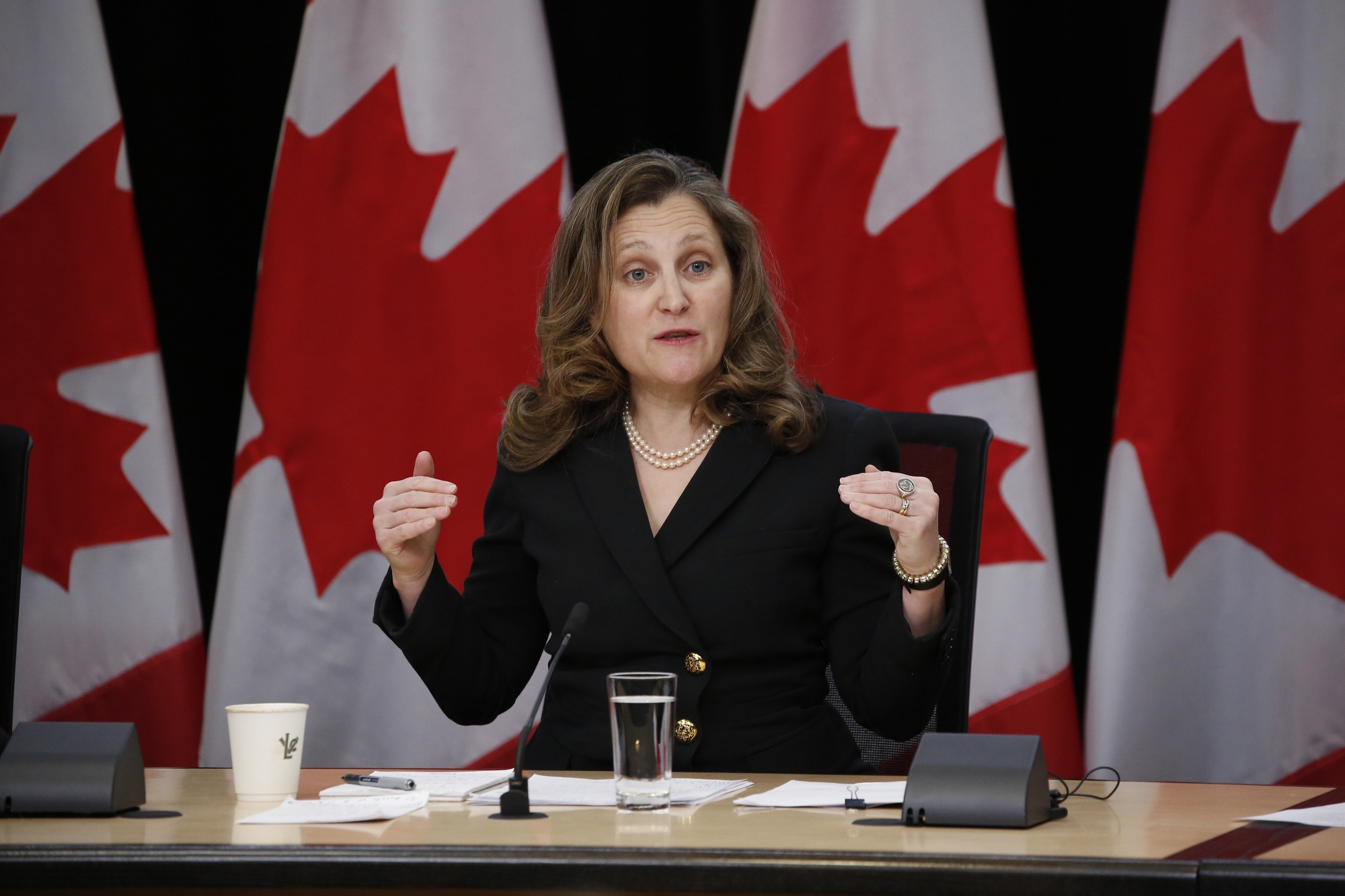克里斯蒂娅·弗里兰,加拿大副总理兼财政部长,在二月份在渥太华举行的新闻发布会上
