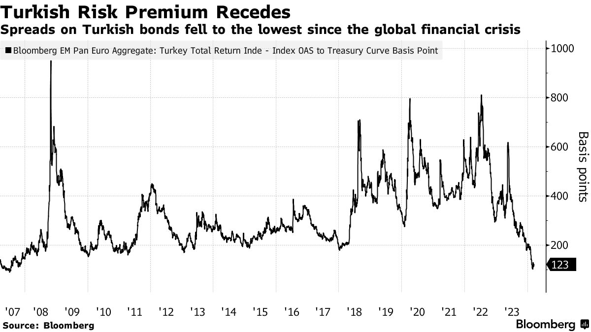 对这个评级为垃圾级别的国家欧元债券的额外风险溢价于2月26日降至104个基点,创下自2007年以来的最低水平,根据彭博指数追踪土耳其债务利差。截至周三,该溢价为123个基点,远低于10年平均值359个基点。