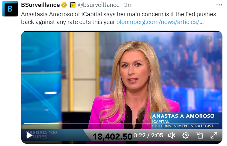 ICapital的安娜斯塔西娅·阿莫罗索指出,政府借款以及其他信贷市场存在潜在问题。她仍然对美联储在今年某个时候放松脚步持乐观态度。她表示,今年美联储基金利率降低是有利于债务再融资的,这是一件好事。
