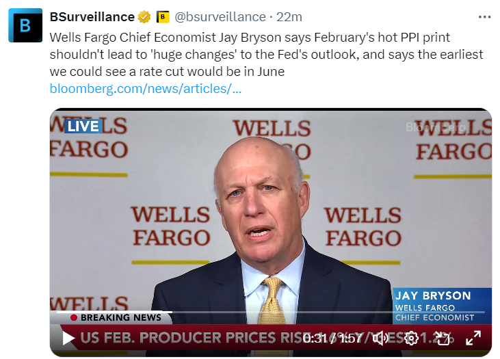 富国银行的Jay Bryson在另一个令人失望的数据点——今天的生产者价格指数公布后,不得不重新评估美联储的降息时间表。他表示,他之前对五月的预测“基本上不再适用”。