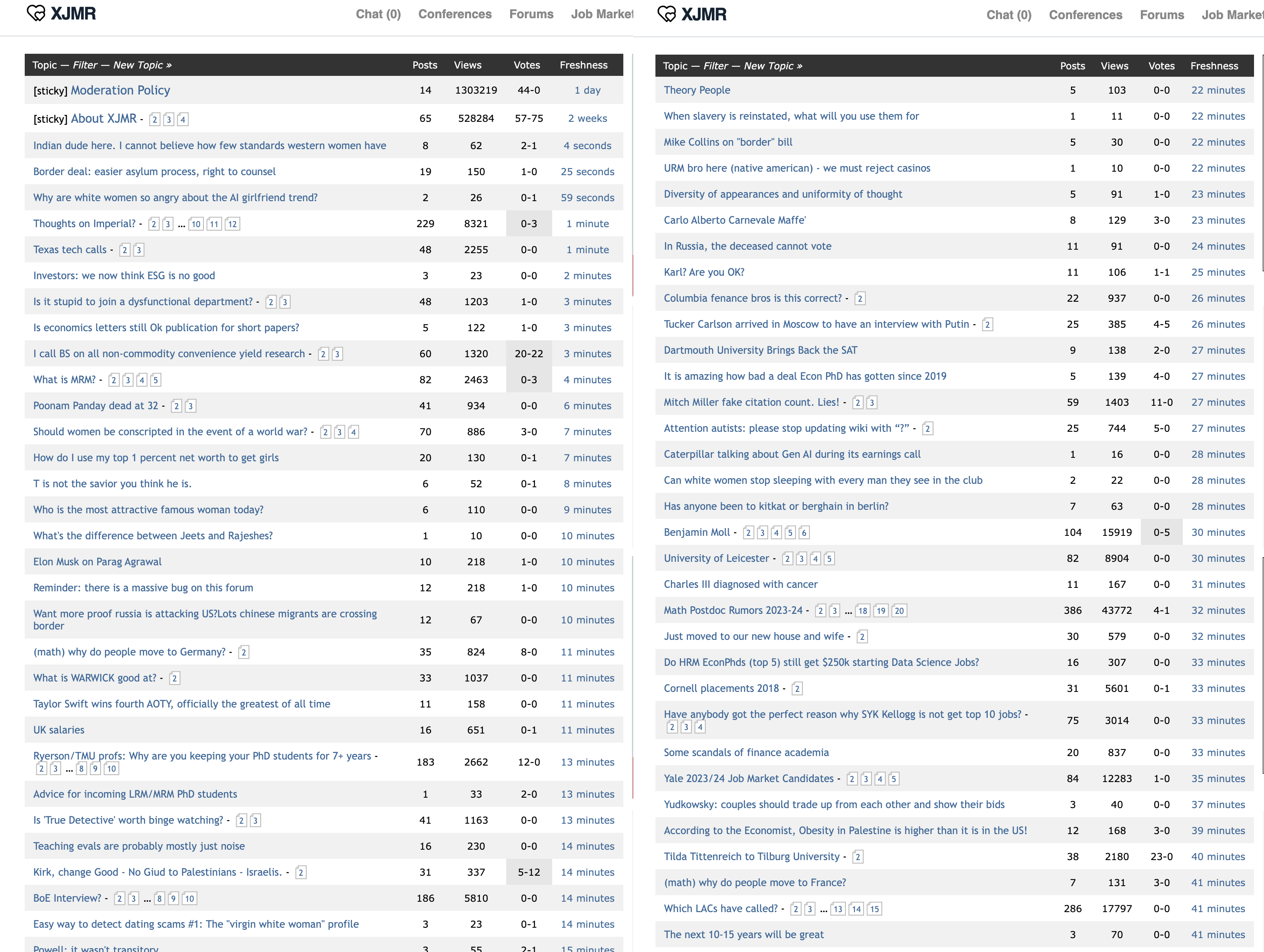 EJMR上的一些话题,最近更名为XJMR。来源:econjobrumors.com到了2010年代中期,该网站每月有数十万访问者。现在它已经让教授们修改他们的论文并影响了他们的职业。对于Rossin-Slater研究的争议也成为了对EJMR本身的一次公投。对一些人来说,这揭示了该网站的黑暗面,所有的性别歧视和怨恨都浓缩成了一个被炒作的伪丑闻。其他人则将其视为对该领域令人沮丧的精英主义和不透明性的一种受欢迎的纠正。