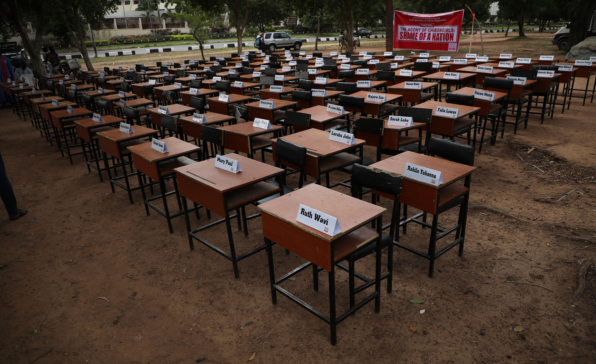 被绑架的奇博克女学生的名字在2019年绑架五周年时显示在课桌上。摄影师:科拉·苏莱蒙/法新社/盖蒂图片社