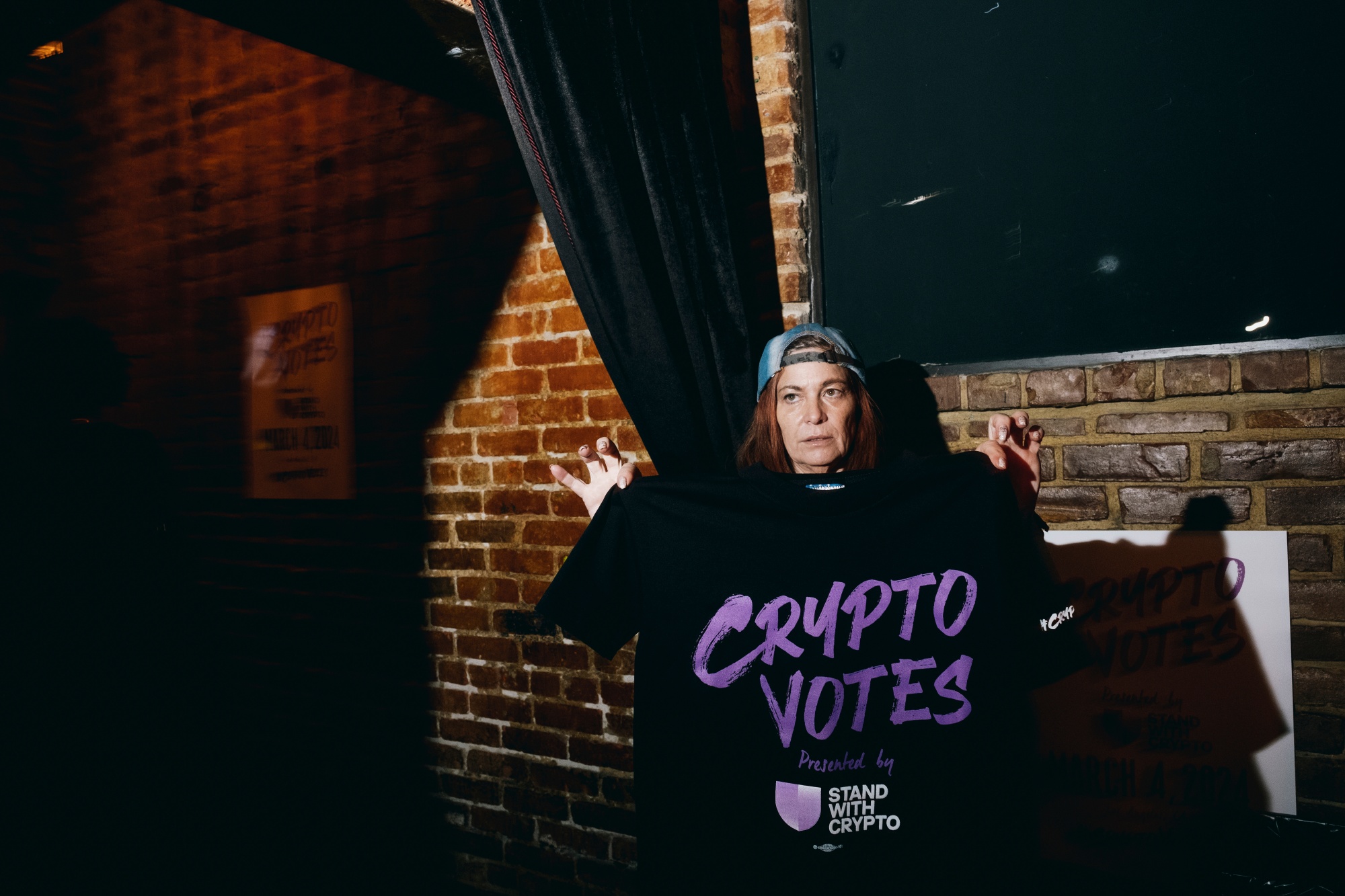 在超级星期二初选前一天,洛杉矶“支持加密”集会上的一名与会者。摄影师:马克·亚伯拉蒙森/彭博社政治上的强硬言论代表了令人瞩目的进化,一年前,加密行业似乎永远无法从一系列丑闻和商业失败中恢复过来,其中最具威胁的人物之一,山姆·班克曼-弗里德,被判犯有刑事罪。
