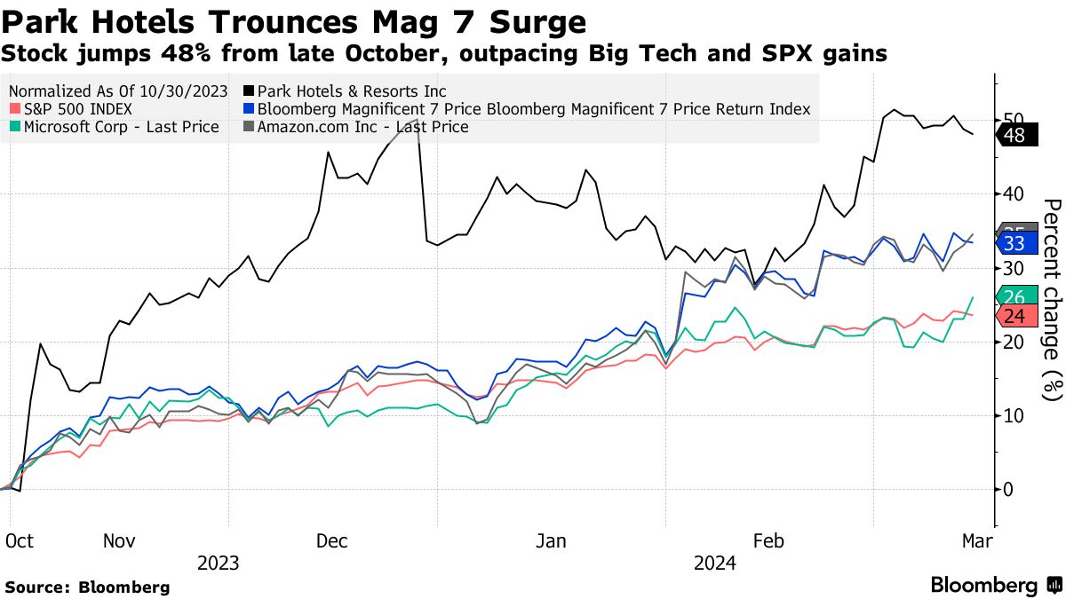自10月27日股票触底以来,酒店和住宿房东的股价上涨了29%,超过了S&P 500指数的23%涨幅和更广泛的房地产行业的19%涨幅。涨幅最大的是,Park Hotels & Resorts Inc.,在这段时间内飙升了53%,超过了所有七大科技股中的每一只股票,除了Nvidia Corp.