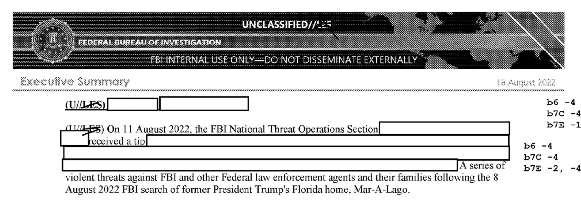 文件提到了一条受到广泛媒体关注的威胁:一名海军退伍军人携带AR-15,在马阿拉戈搜索几天后在社交媒体上表示联邦特工应该被“当场杀死”。他试图闯入FBI辛辛那提分局后,在俄亥俄州与一名州警发生枪战身亡。