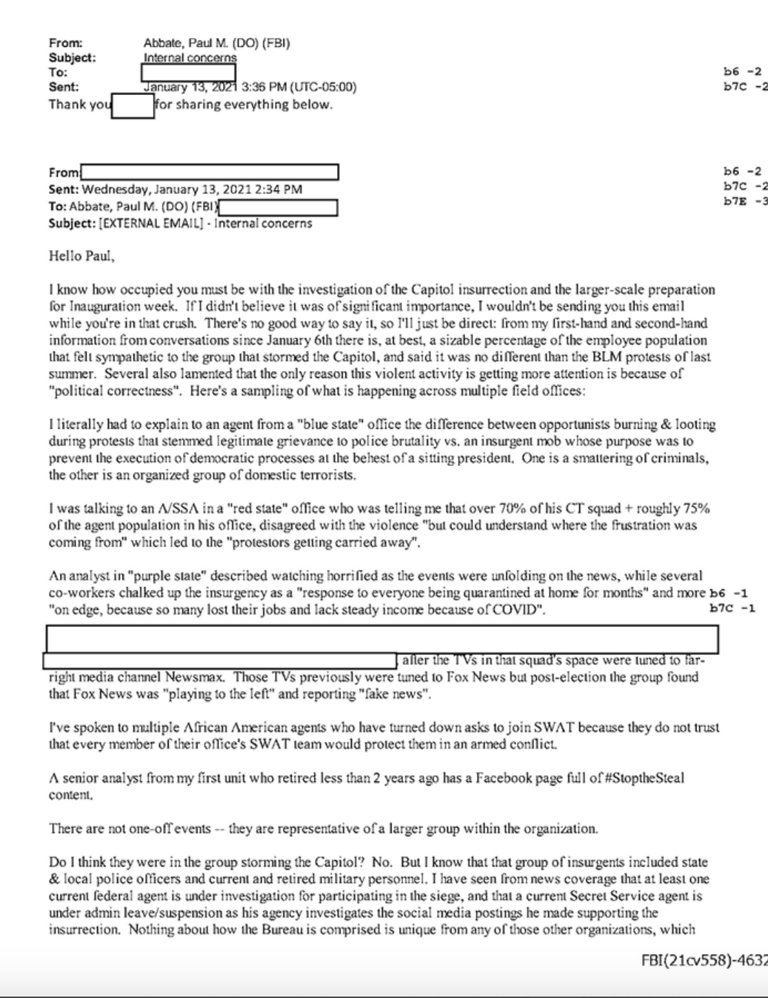 “没有好的说法,”电子邮件写道给副局长阿巴特。“所以我会直接说:根据我自1月6日以来的第一手和第二手对话信息,最好的情况是,有相当大比例的员工群体对冲击国会的人持同情态度,并表示这与去年夏天的BLM抗议活动没有什么不同,”这名特工在骚乱发生一周后写道。