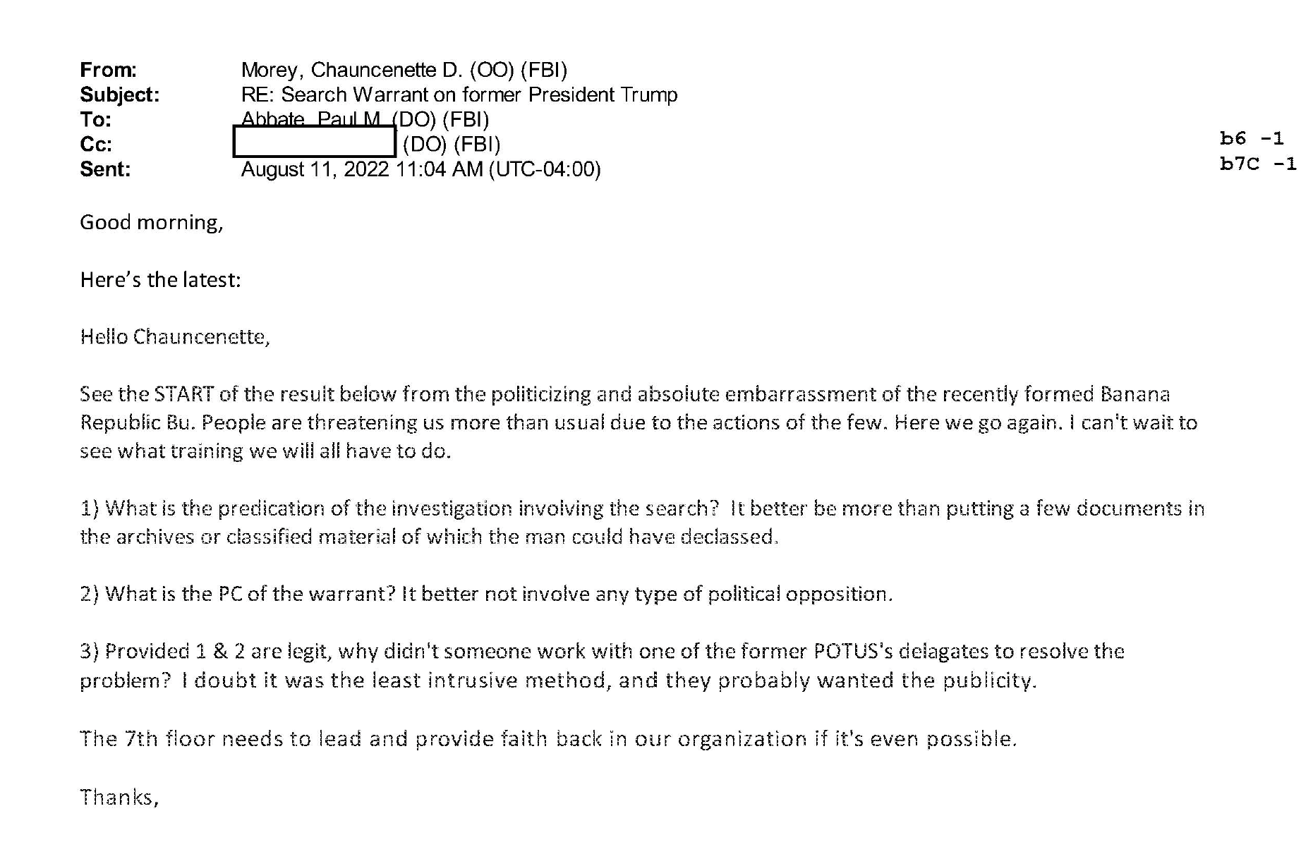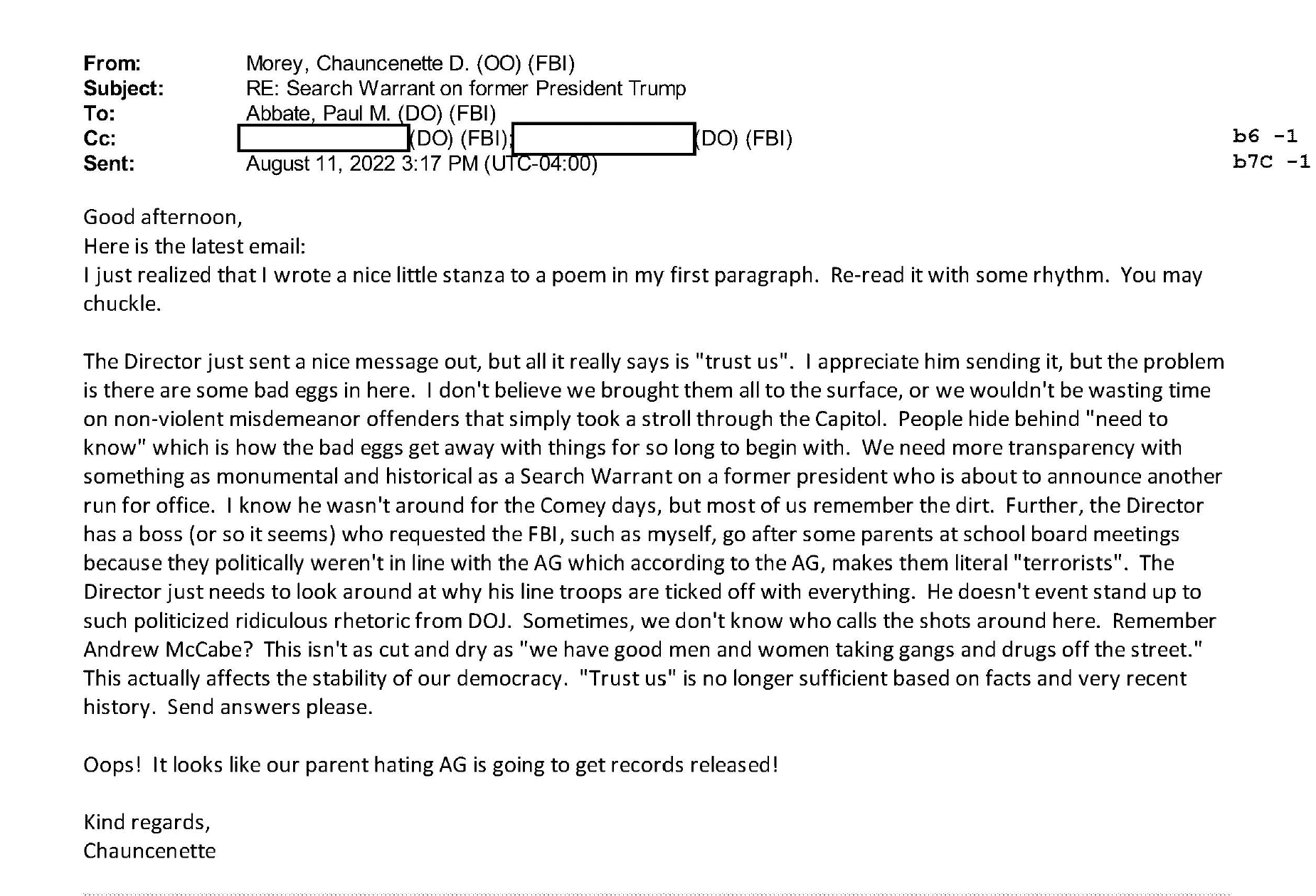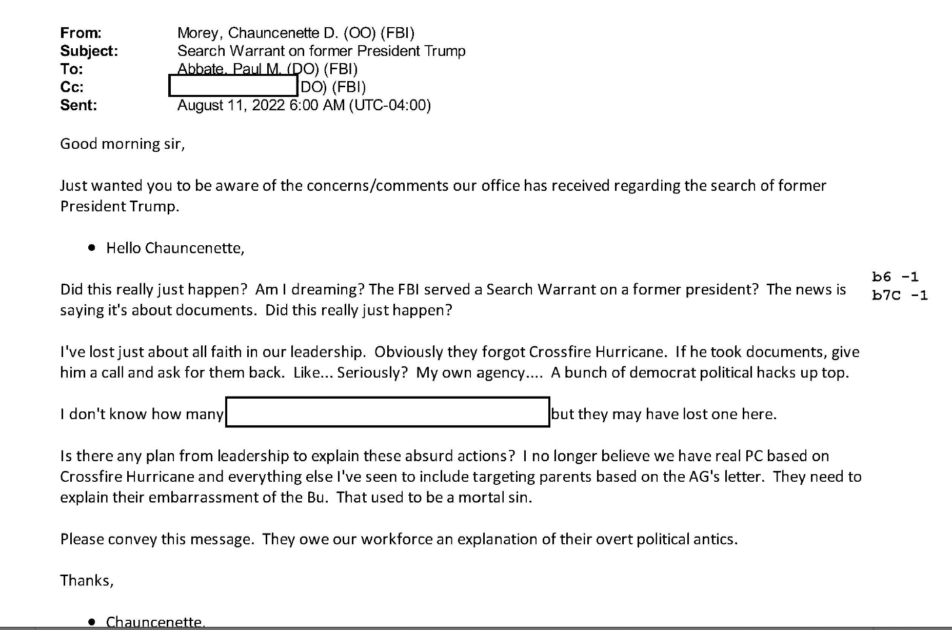 “这真的发生了吗?我在做梦吗?FBI对一位前总统发出了搜查令?”一位怀疑的局内员工在马阿拉戈搜查后不久给FBI代理调解员肖赛内特·莫雷发送的电子邮件中写道。“如果他拿了文件,给他打个电话,要回来。像…真的吗?我的机构…顶层一群民主党政治骗子…我对我们的领导几乎失去了所有信任。”