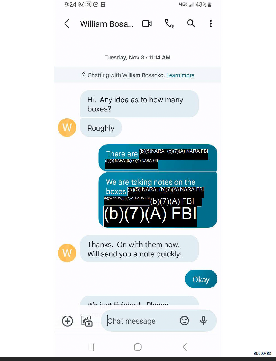 国家档案管理局(NARA)交给我的文件之一是在FBI的要求下根据该豁免进行了编辑。这是一条NARA首席运营官和一名机构官员之间的短信,提到NARA档案管理员从拜登智库检索的“盒子”数量。