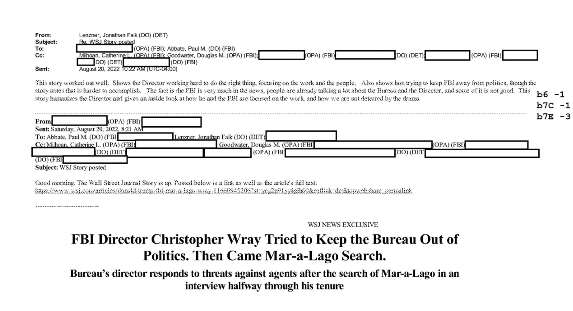 “这个故事进展顺利,”雷的幕僚长乔纳森·伦兹纳在2022年8月20日的一封电子邮件中对高级FBI官员说。“显示出局长努力做正确的事情,专注于工作和人员。”