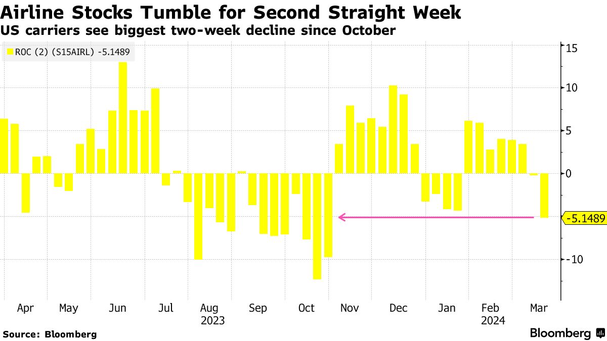 摄影师:Bing Guan/Bloomberg随着波音公司的问题不断加剧,美国航空公司股票正面临自去年10月以来最糟糕的两周跌势,燃油价格波动和波音公司的问题正在撕裂整个行业,引发对飞机交付延迟的担忧。