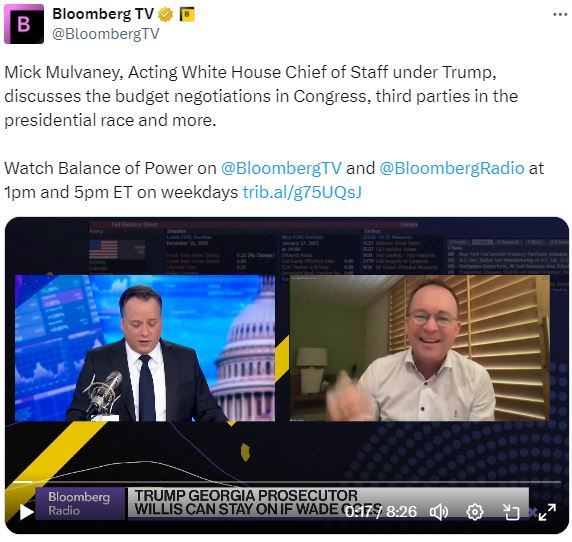 今天在彭博电视台的 权力平衡 早间版节目中,主持人乔·马修采访了米克·马尔瓦尼,他是特朗普政府时期的一名高级白宫官员,谈到了国会的预算谈判和总统竞选中的第三方。