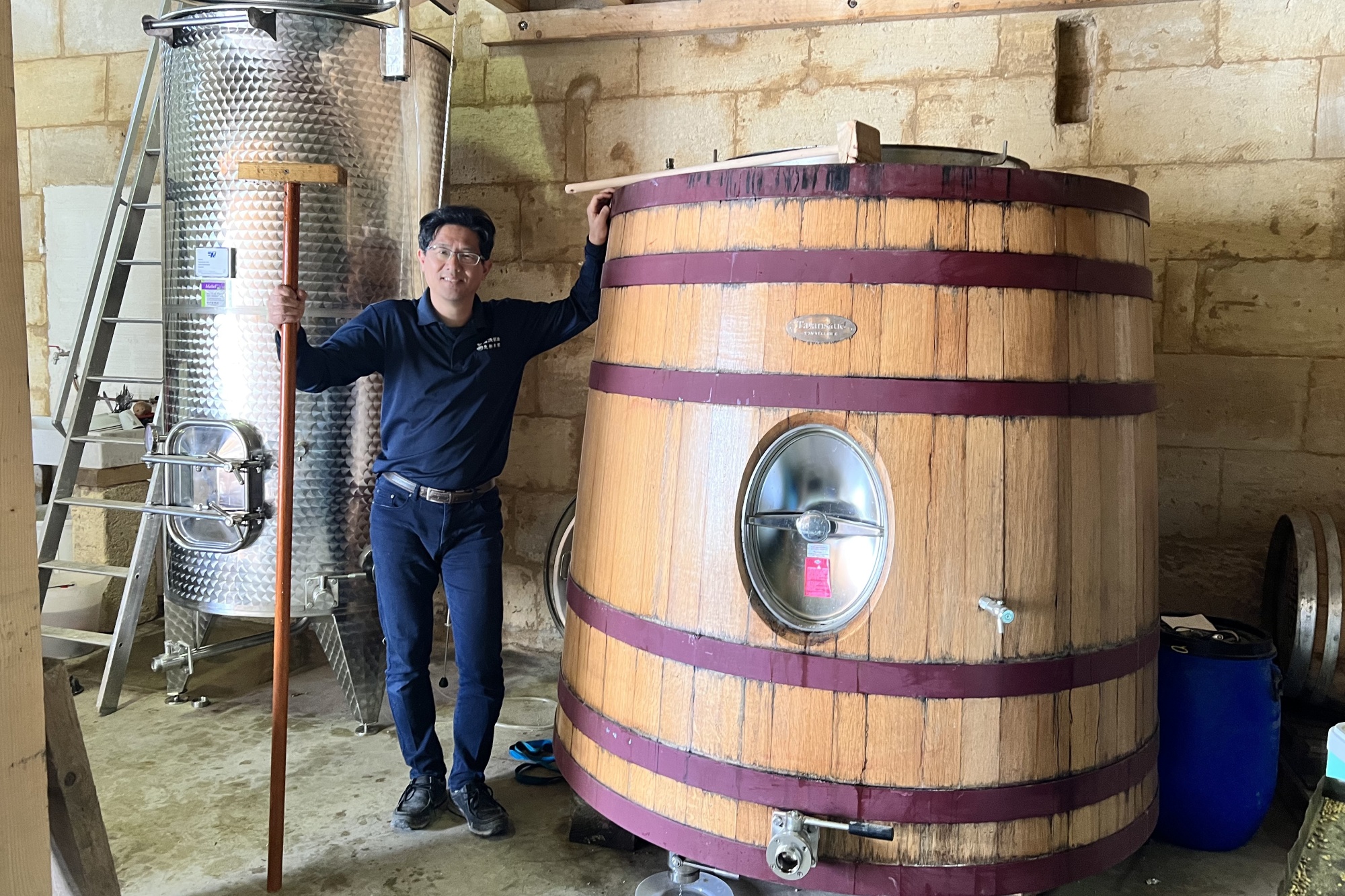 在法国Sainte-Terre的Toshio Shinko。来源:Yuasa酱油Shinko还在法国旅行时尝试用葡萄酒桶制作酱油。他去年与Château Coutet酒庄合作,在波尔多开设了一个餐厅,供应着从葡萄酒桶中获得独特木质风味的酱油。