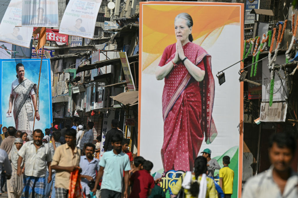 行人走过孟买的国会高级党领导人索尼娅·甘地的海报,日期为3月16日,这是议会选举前。