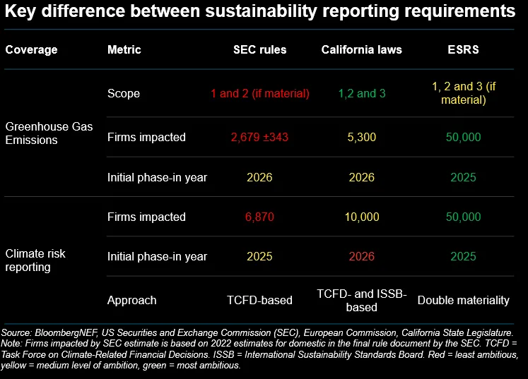 来源:彭博新能源财经美国证券交易委员会 | 美国证券交易委员会(SEC)在其新最终确定的气候相关报告规则上有所保留。与早期草案相比,最终法规要求的报告来自更少的公司,且比欧盟和加利福尼亚的类似标准要弱得多。(彭博新能源财经)