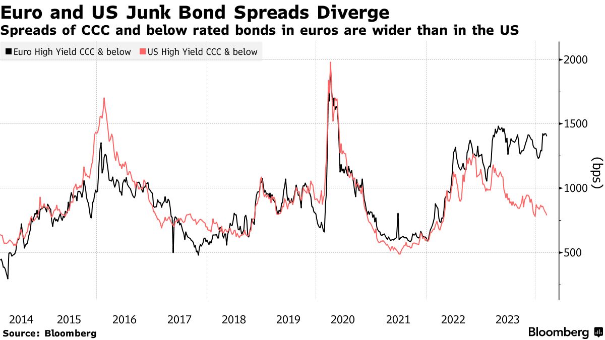 当然,更广泛的收紧掩盖了市场某些部分的分化。来自评级为CCC及以下、极有破产风险的公司发行的以欧元计价的债券错过了普遍的涨势。此外,标普全球评级公司最近表示,2024年企业破产数量达到自2009年以来最高水平。