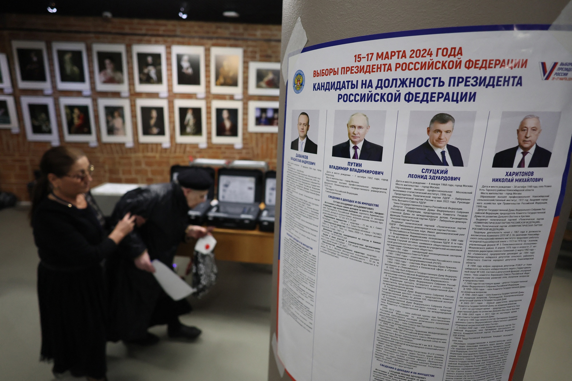一张海报上列有四位总统候选人的传记,包括弗拉基米尔·普京,于3月15日在莫斯科的一个投票站展出。来源:法新社/盖蒂图片社俄罗斯在乌克兰被占领地区组织了总统选举投票。基辅的外交部表示这些选票是非法的,并呼吁这些地区的乌克兰人不要参加“伪选举”。