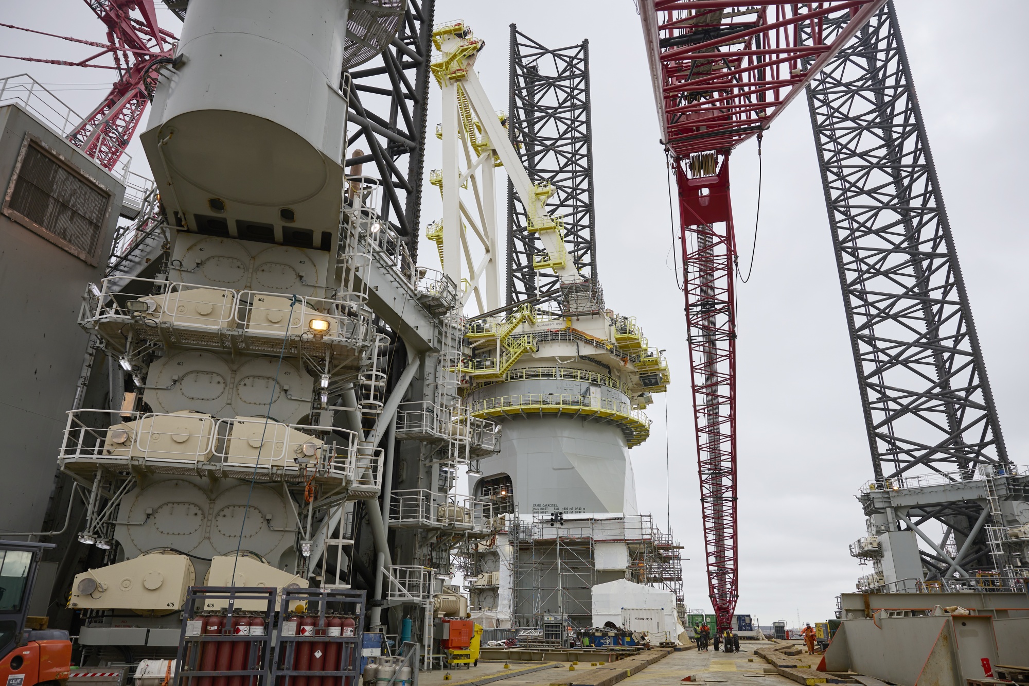 新起重机,中心,被脚手架和千斤顶包围,从2月6日在荷兰斯海丹的Wind Osprey甲板上拍摄。摄影师:Ksenia Kuleshova/Bloomberg在陆地上建造一个巨大的风力涡轮机是一项复杂的任务,更不用说在开阔的海洋上了。首先要小心地将组件装载到一艘船上。塔和叶片可能超过100米长,而容纳发电机的集装箱,称为机舱,大约是一个别墅大小。一旦船到达涡轮机的未来位置,这些部件必须被拆卸和组装。安装一个涡轮机大约需要三天的时间,具体取决于到达港口的旅行时间。