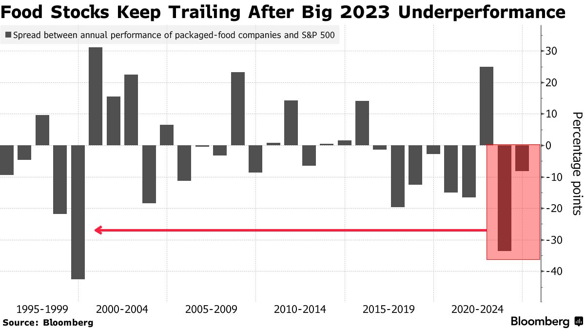 这解释了为什么消费品行业的一个关键部分,即包装食品制造商,在年初落后于 S&P 500 指数 。但这个群体已经遭受了一段时间的困扰,在2023年相对于更广泛市场的表现是二十多年来最差的。许多公司去年报告的销售量下降幅度超出预期,华尔街对如果更多人开始服用抑制食欲的药物,包装食品制造商可能受到的影响越来越感到紧张。