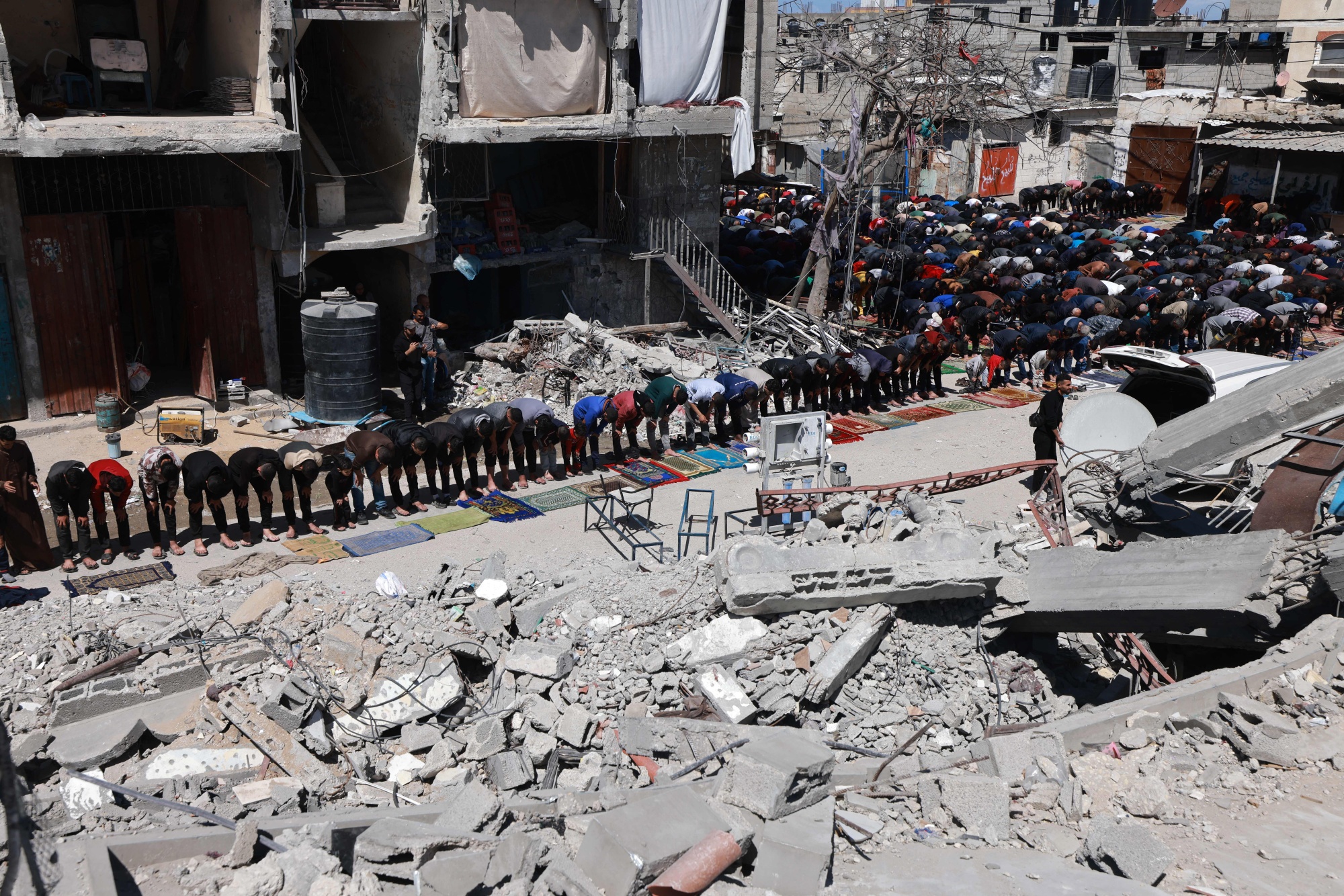 巴勒斯坦人在3月15日的阿尔法鲁克清真寺废墟前祈祷。