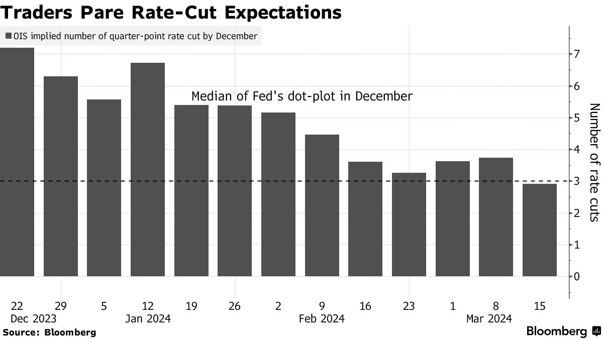 就在去年12月,债券交易员几乎可以肯定美联储将在本周的会议上开始放松政策。但在一系列意外强劲的增长和通胀数据发布后,他们认为本周采取行动的可能性为零,5月份的行动几乎没有可能,而6月份降息的可能性仅为60%。在今年,交易员们预计总共将减少71个基点,这意味着三次全季度的降息不再被视为必然。
