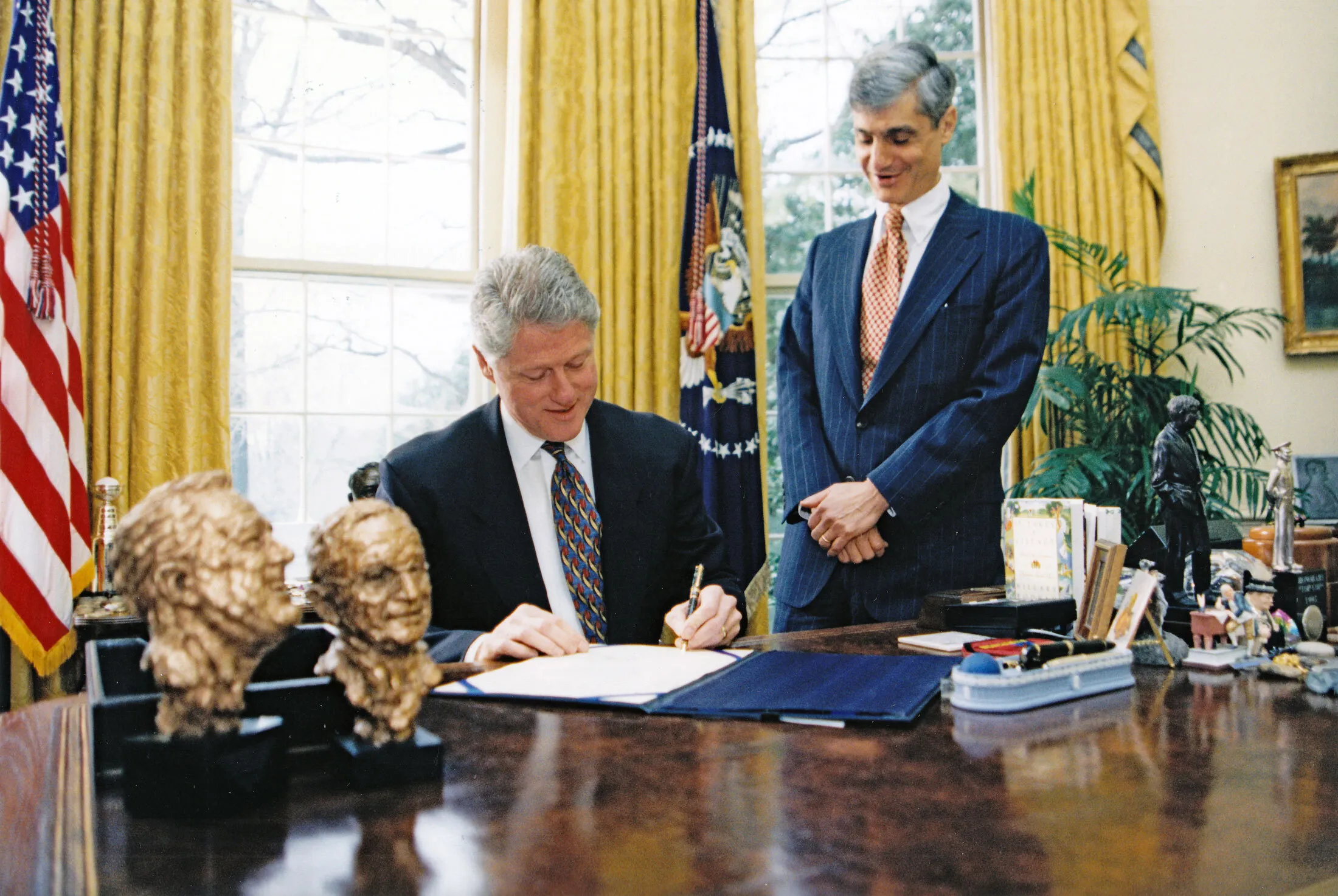 比尔·克林顿总统和鲁宾部长在1996年白宫签署债务上限延长法案时。摄影师:香农·法默 白宫/CNP/Zuma Press强势美元帮助美国经济在1990年代繁荣。在比尔·克林顿执政期间,经济增长在通胀调整后的平均水平为3.8%,而他的前任罗纳德·里根和乔治·布什则为2.8%。但强势美元也带来了隐蔽的副作用。与中国的崛起相结合,它导致了美国制造业的空心化。铁锈带州看到工厂关闭,公司城镇崩溃,因为雇主迁往成本更低的地方。