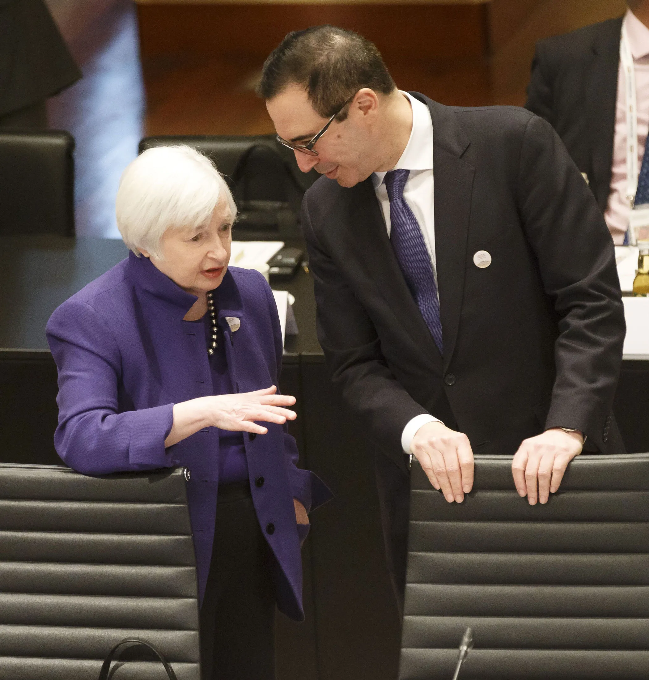 耶伦和姆努钦在2017年德国巴登巴登的G-20财政部长和中央银行行长会议上。摄影师:罗纳德·维特克/EPA/Shutterstock总统乔·拜登维持了特朗普的关税,同时将“美国优先”的措辞换成了“友好外包”和“购买美国制造”。尽管如此,拜登在美联储几乎进行了十几次加息以遏制通胀时,仍然保持了距离,帮助美元在他任期内对其他主要货币升值了约15%。