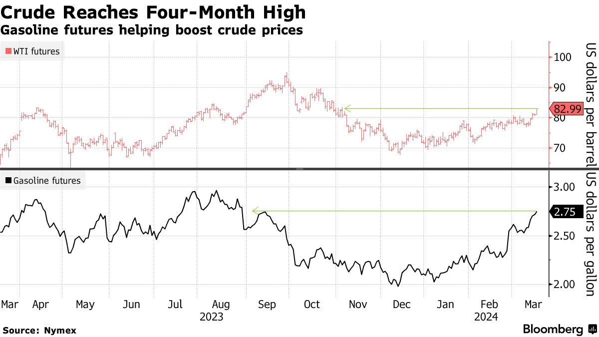 西德克萨斯中质油上涨超过2%,首次收于82美元以上,自去年十月底以来首次。中国的工厂产出和投资在年初增长超出预期,数据显示该国精炼了创纪录的原油。