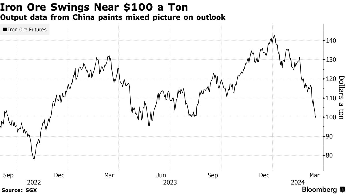 期货——上周下跌超过13%——在新加坡下跌了最多2.9%,至每吨97美元,然后反弹超过该幅度。尽管中国的整体增长在年初受到工厂产出和投资强劲的支撑,但全国钢铁生产在前两个月仅略有上升。