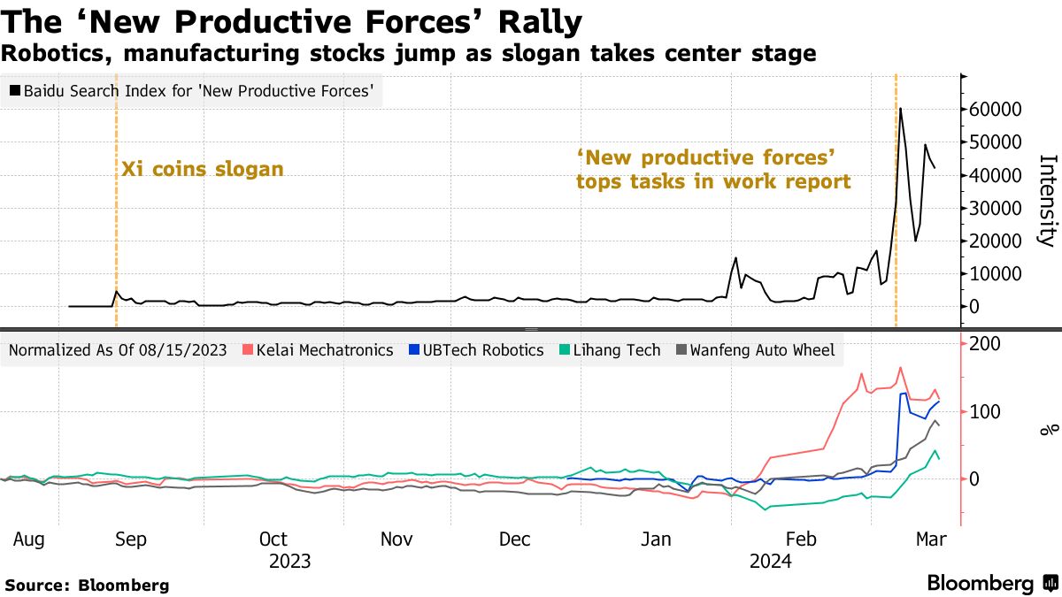 因此,当“新生产力”被列为政府年度 优先事项声明时,它引发了一场解读这一短语提升的含义的争论——这个短语是习近平主席去年九月提出的。自2014年以来,只有一次工业政策口号获得过最高地位。通常,这个位置是关于宏观经济政策的承诺。