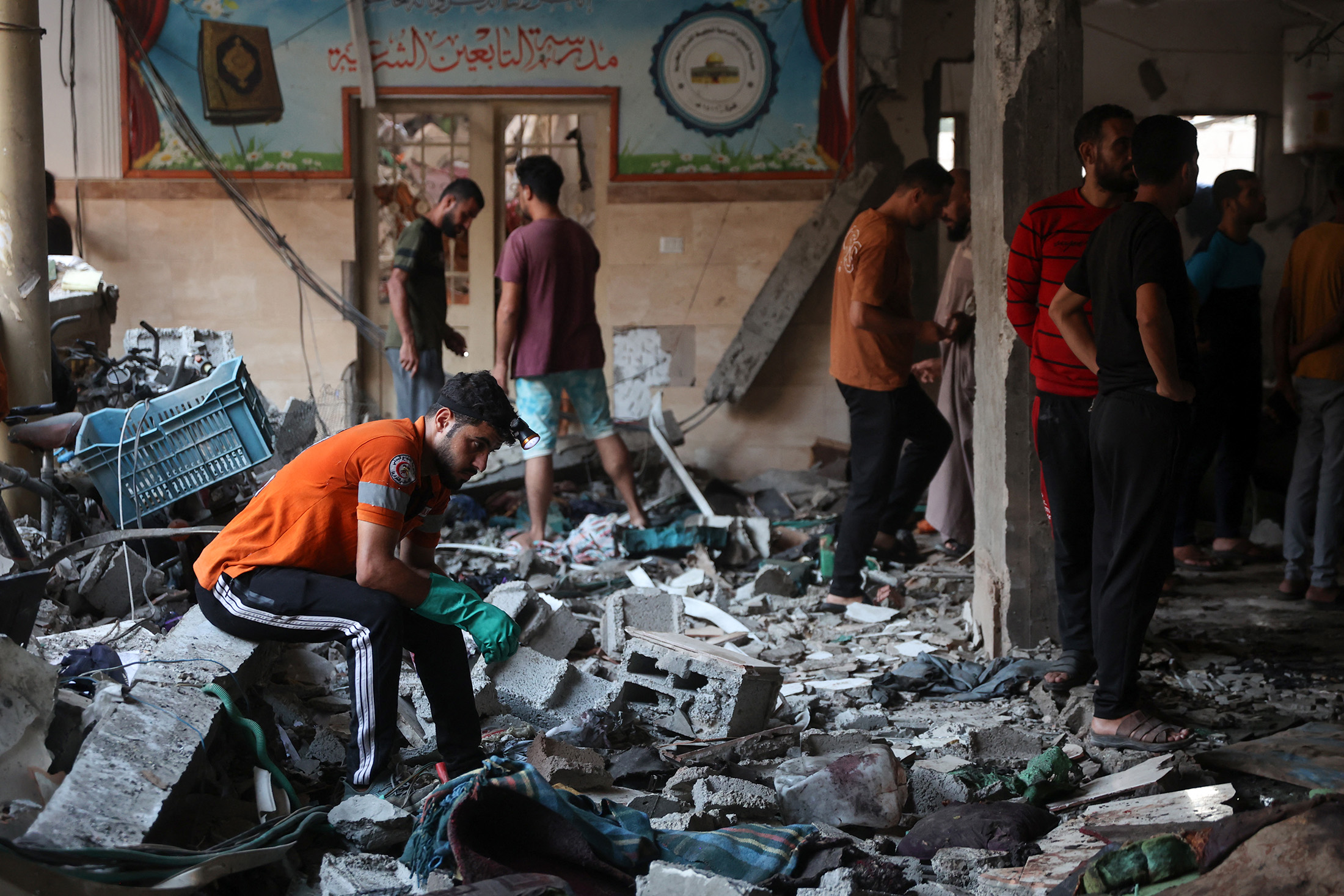 巴勒斯坦人在加沙市一所遭以色列空袭的学校院子里聚集,时间是8月10日。