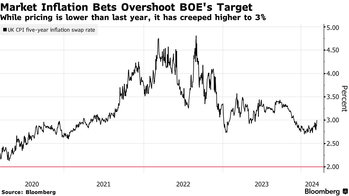 自那时以来,这些市场代理指标进一步高于英格兰银行的目标,可能需要官员们保持谨慎。五年期通货膨胀掉期利率——衡量投资者为对冲消费者价格上涨而要求的补偿——已悄然上升至3%。这可能反映了投资者对降息次数减少的预期,交易员们预计今年仅会有大约三次25个基点的降息,而2月初则预计有六次。