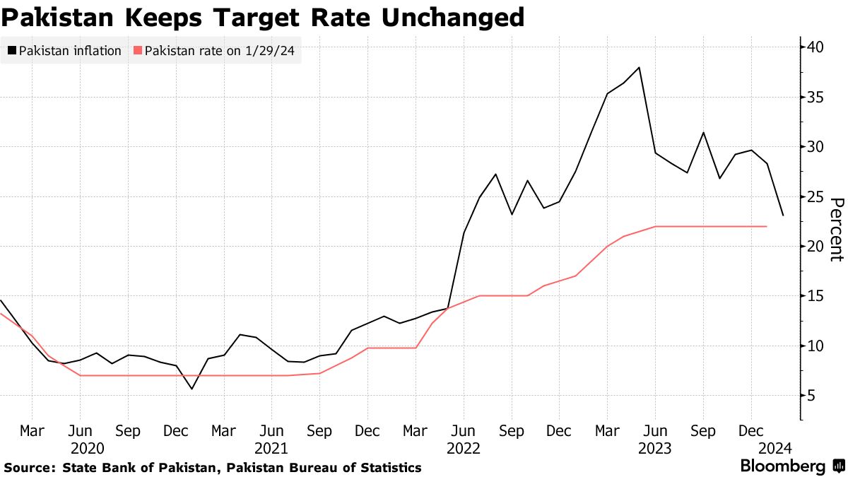 巴基斯坦国家银行将目标利率维持在22%,根据周一发布的声明。在彭博社调查的37位分析师中,有30位预测将维持不变,其余则预计会降息。