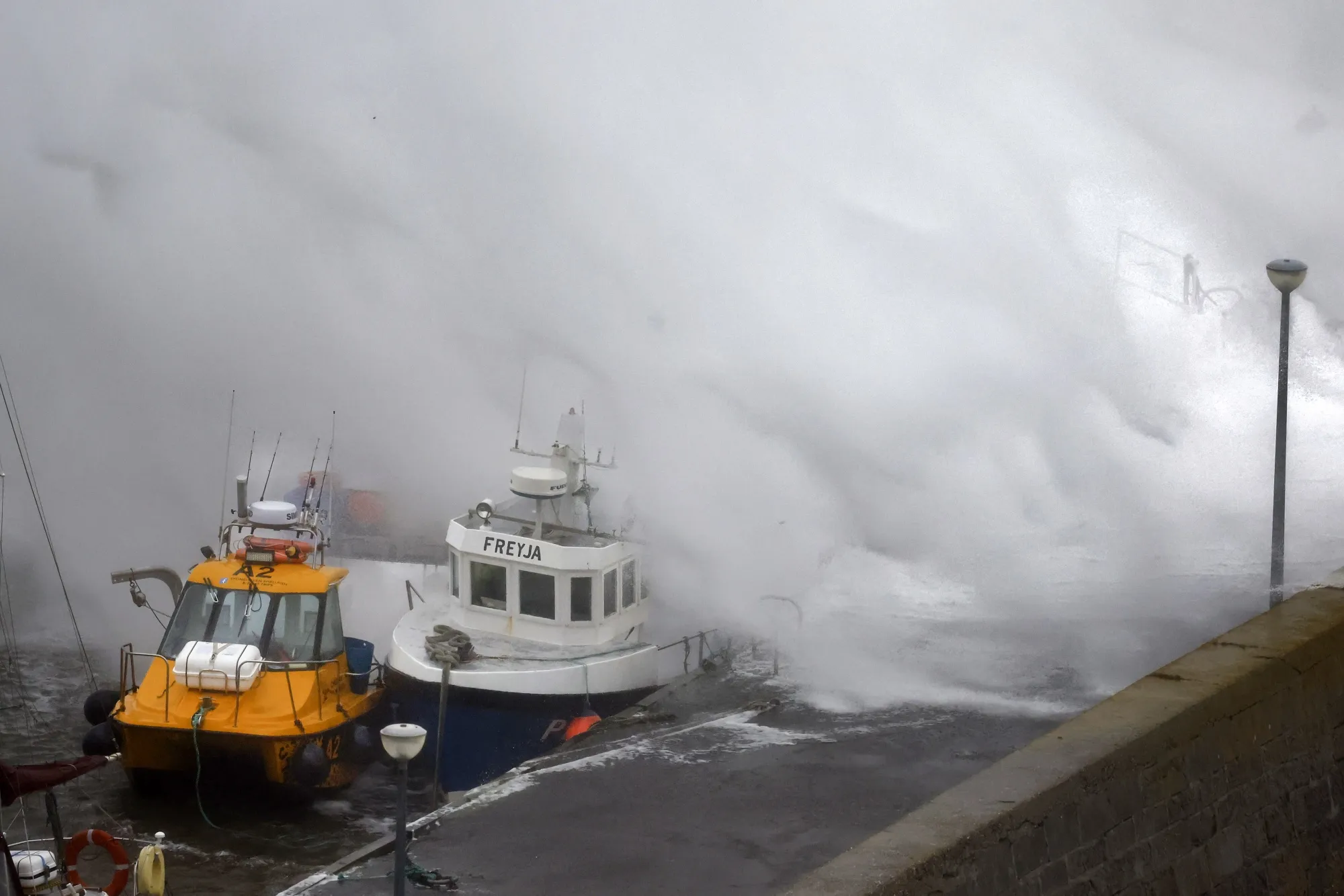 在2023年10月19日,苏格兰斯通黑文,暴风雨巴贝特期间,海浪冲击港口。摄影师:杰夫·J·米切尔/盖蒂图片社BG: 欧洲已经开始命名热浪。气象局在英国是否有类似的计划?