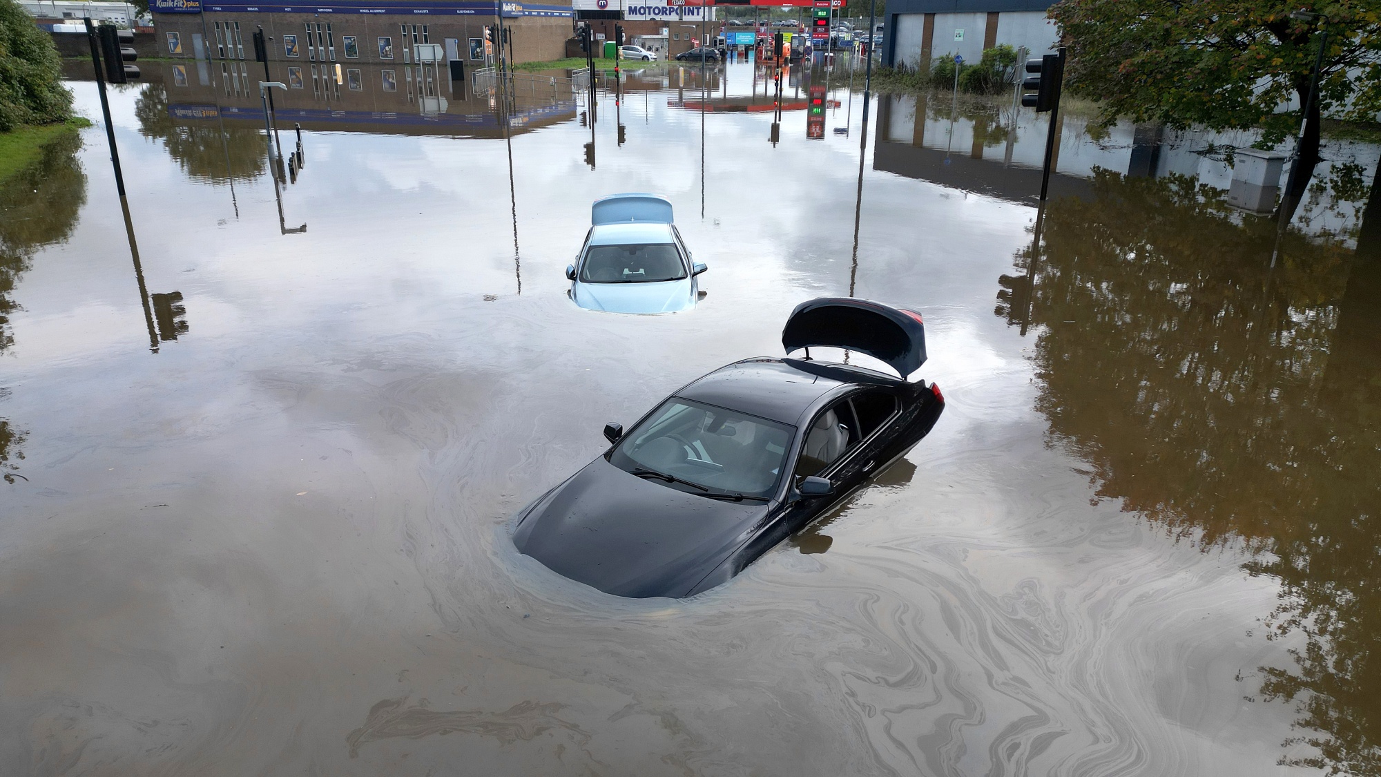 在2023年10月21日,英国德比的暴风雨巴贝特期间,淹没的汽车被遗弃。