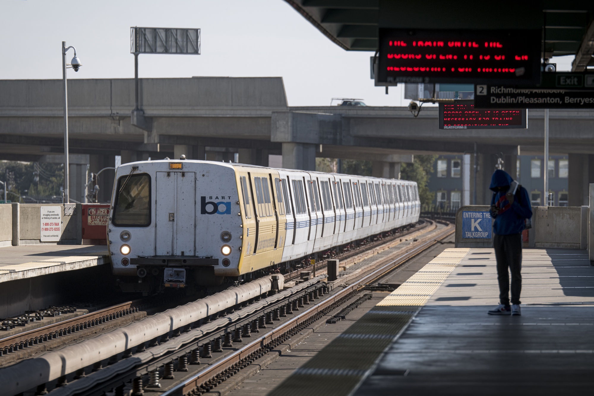 一名人士在美国加利福尼亚州奥克兰的湾区快速交通(BART)火车站的站台上等待,时间是2020年10月26日,星期一。摄影师:大卫·保罗·莫里斯/彭博社