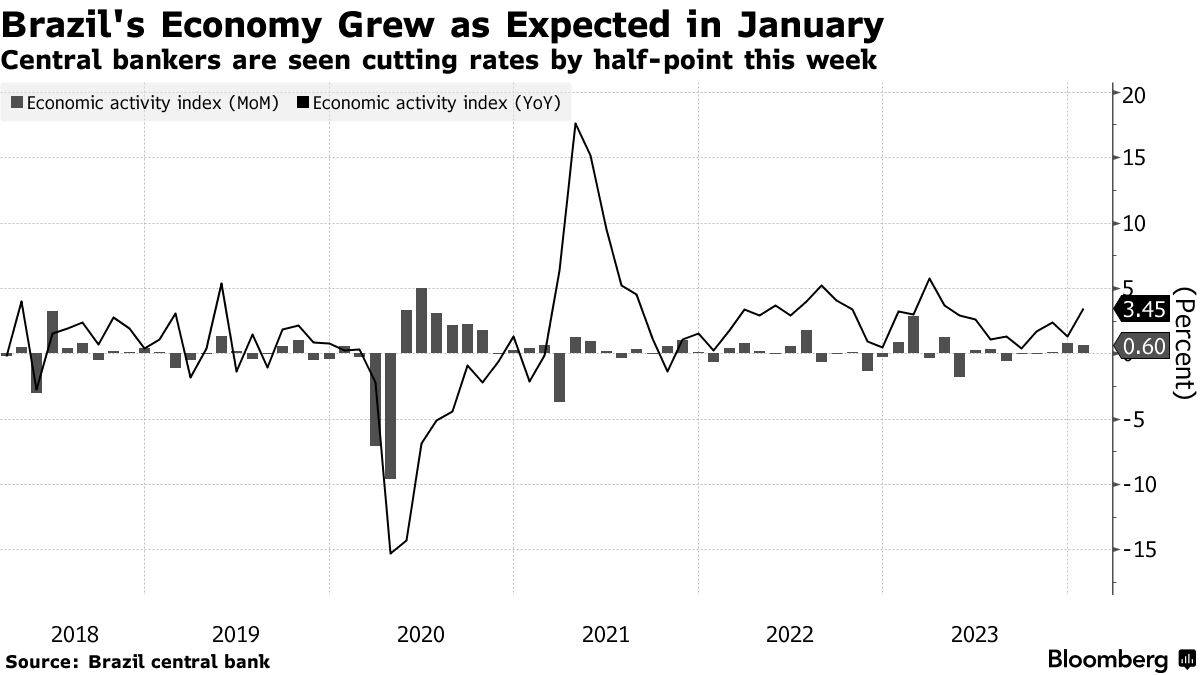 巴西的经济活动在年初连续第五个月扩张,投资者考虑中央银行在周三的政策会议后将继续进行半个百分点的降息多久。